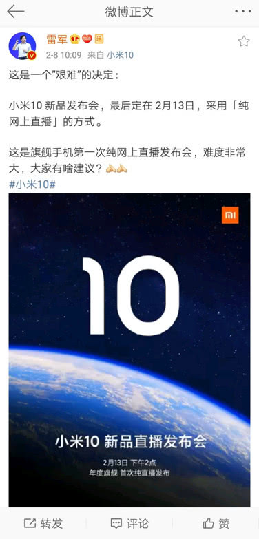2月8日,小米宣布最新旗艦小米10新品發布會依然會如期發布,時間定在2月13日,只是改為了“純網上直播”的方式。