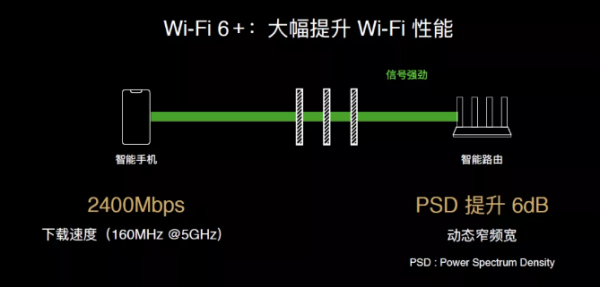 華為Wi-Fi 6+帶來兩大特性:一是端到端支持160MHz超大頻寬,近距離暢享雙倍速度;二是動態窄頻寬技術,報文按需自動分片,確保路由和手機等終端設備可穩定工作在窄頻寬模式,大幅提升手機等終端側的功率譜密度,實現多穿一堵墻的效果。簡單來說,近距離速度快一倍,遠距離多穿一堵墻。