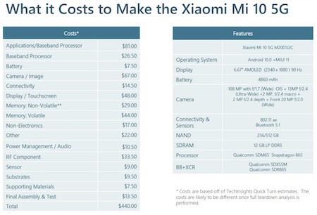 旗艦殺手們在硬件配置上如何進行取舍,不妨先來看看此前TechInsights給出的已知的兩款機型的BOM成本單,分別為超級旗艦級別的代表Galaxy S20 Ultra,另一款為旗艦殺手級別的代表小米10。三星S20 Ultra的整機物料成本為528.50美元,其中最貴的零部件為相機,成本107.50美元,其次為81美元的驍龍865,第三為67美元的屏幕。小米10的整機物料成本為440美元,其中最貴的零部件為81美元的驍龍865,其次為相機部分67美元,第三是屏幕部分48美元。