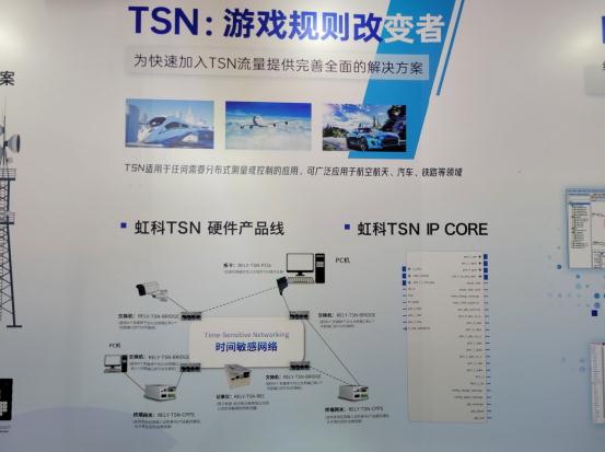 TSN時間敏感網絡產品技術方案則展示了TSN4端口交換機,TSN視頻流生成器,TSN阻塞流量生成器,DEMO的Web演示配置界面,該DEMO 展示了TSN時間同步,流量調度等核心功能,另外我們的logo墻也展示了我們的TSN硬件產品以及面向TSN 的IPcore方案,可以面向需要開發TSN多端口交換機的客戶。