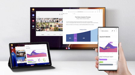 以三星DeX為例,無(wú)疑是希望手機(jī)成為移動(dòng)工作站,不僅是可以投射到顯示器,還可以投射到電視。該功能此前還依賴于通過(guò)有線的方式來(lái)輸出屏幕信號(hào),自三星One UI 2.5后,還新增了無(wú)線模式,再次提升了該功能的便捷性,連接成功后,手機(jī)屏幕則可以變身為觸控板。此舉無(wú)疑進(jìn)一步降低了手機(jī)作為生產(chǎn)力核心后,對(duì)于外設(shè)的依賴程度。