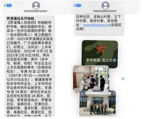 保家衛國終不悔,馳騁疆場獻青春。春季征兵“集結號”已然吹響,為助力提高廣大人民群眾對征兵信息和政策的知曉率,引導和激勵適齡青年踴躍報名、應征入伍,常州移動積極對接新北區羅溪鎮、孟河鎮、薛家鎮、新橋鎮政府,發揮大數據精準政務短信優勢,協助推進2023年春季征兵工作。