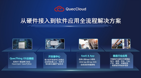 針對目前很多物聯網設備的上云需求,移遠通信在眾多細分領域提供了完整的云平臺和APP整體模組加云的解決方案。本次移遠通信物聯網生態大會上,移遠通信還正式推出了物聯網云服務—QuecCloud。QuecCloud具備智能硬件開發、物聯網開放平臺、行業解決方案三大能力,可為開發者和企業用戶提供從硬件接入到軟件應用的全流程解決方案,助力行業客戶快速實現智能化升級和商業化落地。