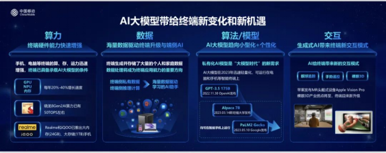 中國移動給出了自己的判斷:手機、電腦等終端的算、存、運力迅速增強,終端已具備承載AI大模型的條件; 再加上終端生成并存儲了大量的個人和家庭數據,私有化AI模型是“大模型時代”的新需求。