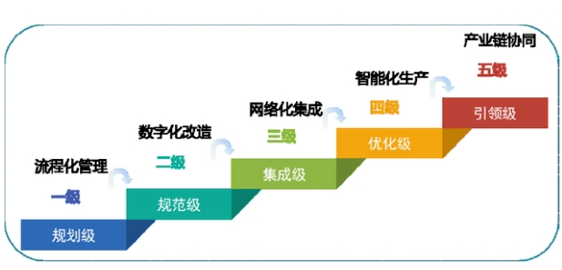 智能制造能力成熟度模型描述了企業實施智能制造要達到的階梯目標和演進路徑,提出了實現智能制造的核心要素、特征和要求,從人員、技術、資源、制造等要素維度,從低到高分五個成熟度等級綜合評價企業數字化、網絡化、智能化發展水平。其中,一級為流程化管理(規劃級),二級為數字化改造(規范級),三級為網絡化集成(集成級),四級為智能化生產(優化級),五級為產業鏈創新(引領級)。目前國內智能制造能力最高的企業為四級水平,全國暫無企業通過五級認證。