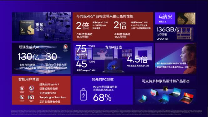 生成式AI是高通進軍PC市場的重要驅動力。高通致力于攜手微軟打造下一代PC,增強手機和PC之間的協同,為用戶帶來他們想要的高性能、長續航、高便攜性PC。在2023年驍龍峰會發布的驍龍X Elite就是為了完成這一任務,這款PC平臺搭載了高通自研的Oryon CPU,能夠為PC帶來業界領先的性能。同時,生成式AI走向終端側為驍龍X Elite帶來了機遇,這款平臺賦能的終端能夠實現高達75TOPS的出色AI性能,支持Microsoft Copilot在終端側跨所有應用運行。隨著Windows向由Copilot賦能的AI體驗轉變,驍龍X Elite將會是為消費者帶來下一代Windows PC體驗的首選平臺。