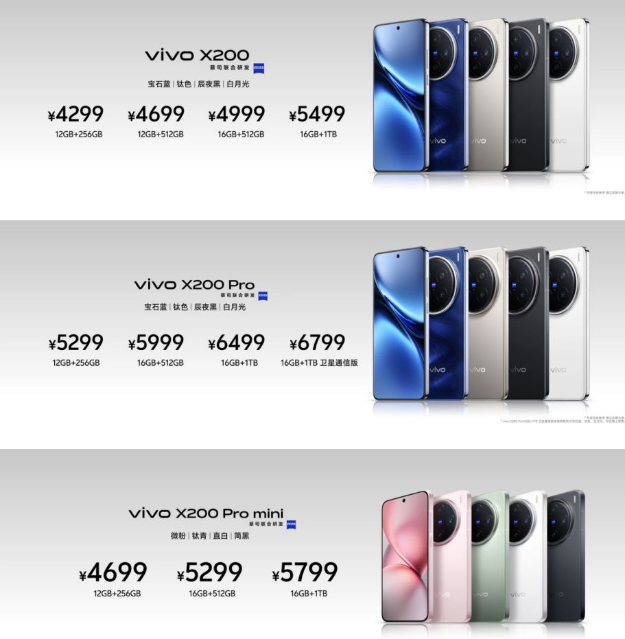 此次,vivo共發布vivo X200、vivo X200 Pro和vivo X200 Pro mini三款產品。其中,vivo X200和vivo X200 Pro共有寶石藍、鈦色、白月光、辰夜黑四款配色,將于10月19日正式發售,vivo X200起售價4299元,vivo X200 Pro起售價5299元。vivo X200 Pro mini共有鈦青、微粉、直白、簡黑四款多彩配色,將于10月25日正式發售,起售價4699元。
