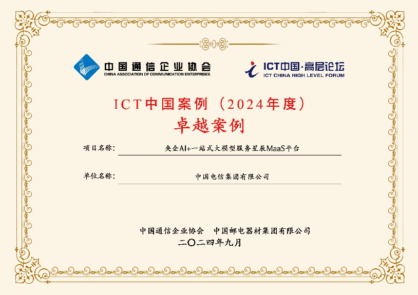 近日,中國通信企業協會發布了“ICT中國(2024)案例”的評選結果,中國電信政企信息服務事業群申報的7個案例獲獎。其中,《央企AI一站式大模型服務-星辰MaaS平臺》《文物安全智治系統建設項目》榮獲一等卓越案例;《“智X119”智慧消防大數據應用平臺》榮獲二等杰出案例;《解決方案自動化設計-知識庫大模型》《商機自動化管理與分析-方案解構大模型》《中小微ICT大模型-翼企問》《面向建筑行業的多模態智能助手應用(星辰-住建大模型)》榮獲三等優秀案例。