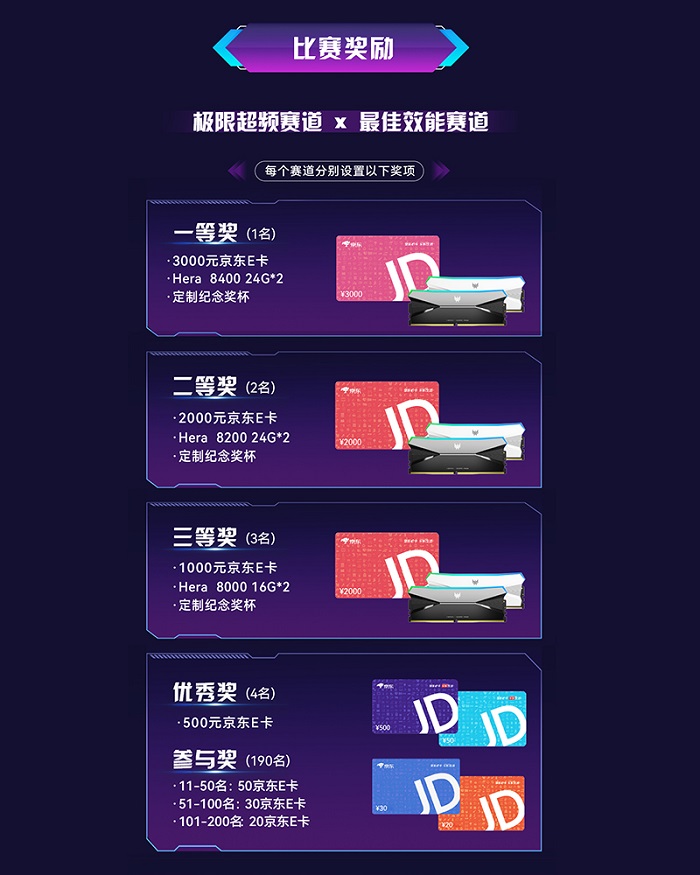 每個賽道的一等獎將獲得3000元京東E卡、掠奪者DDR5旗艦內(nèi)存HERA影鋒的頂配頻率,并帶走冠軍獎杯。二等獎、三等獎也將分別獲得超千元京東E卡、掠奪者DDR5旗艦內(nèi)存HERA影鋒和定制獎杯。此外,掠奪者存儲還為前十、前兩百名的選手設(shè)置了特殊獎勵,讓更多選手享受比賽、更多努力得到認可。