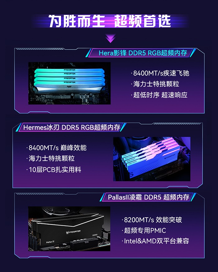 本次超頻挑戰(zhàn)賽的內(nèi)存條指定產(chǎn)品為掠奪者DDR5超頻內(nèi)存(HERA影鋒、HERMES冰刃或PALLAS II凌霜),更有針對Z890&X870平臺特殊調(diào)優(yōu)、至高8400MT/s的新款頻率型號可選。無論是酷炫超頻燈條,還是硬核馬甲內(nèi)存條,都具備卓越性能和超頻潛力,都能成為你超頻沖擊之路的得力助手。
