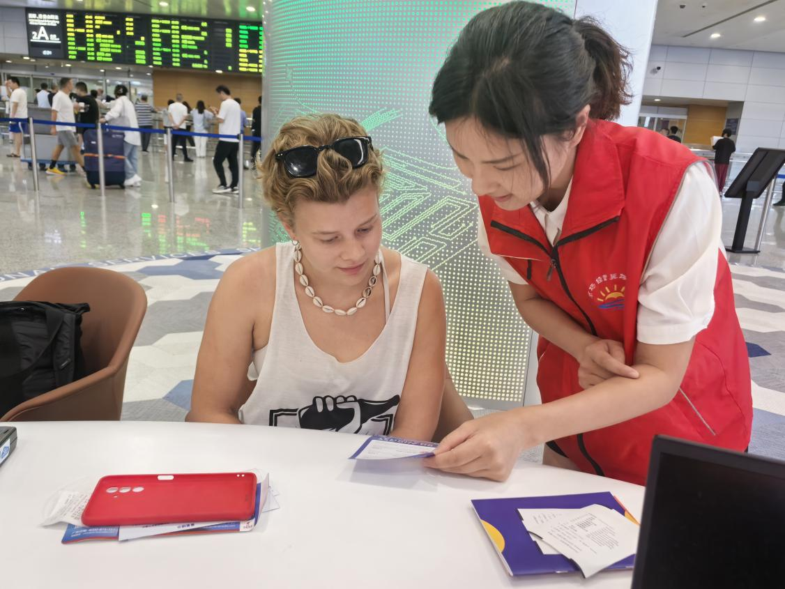 (外籍游客在浦東機場T2航站樓入境一站式綜合服務中心就能方便快捷地辦理電信業務,感受人民城市近悅遠來的消費服務環境。)