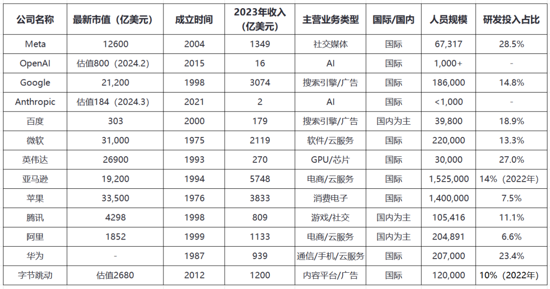 一是市值或估值都很高,絕大部分在數(shù)千億到數(shù)萬(wàn)億美元之間;二是大都為成立時(shí)間較早的科技巨頭;三是收入規(guī)模大,從數(shù)百億到數(shù)千億(兩家創(chuàng)企OpenAl、Anthropic除外); 四是主營(yíng)業(yè)務(wù)以互聯(lián)網(wǎng)服務(wù)、云計(jì)算和軟硬件服務(wù)為主;五是人員規(guī)模大,基本都在數(shù)萬(wàn)到超百萬(wàn)(兩家創(chuàng)企除外);六是研發(fā)投入占比高,Meta、英偉達(dá)、華為研發(fā)投入占比超20%;百度、谷歌、微軟、騰訊超10%。
