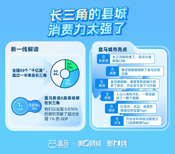 《報(bào)告》顯示,長(zhǎng)三角仍是全國(guó)消費(fèi)力最為強(qiáng)勁的區(qū)域之一,城市間的商業(yè)資源分布最為均衡。在全國(guó)59個(gè)“千億縣”中,超過(guò)一半來(lái)自長(zhǎng)三角地區(qū)。今年盒馬進(jìn)入了其中6強(qiáng):常熟、桐鄉(xiāng)、義烏、諸暨、德清、張家港。每當(dāng)盒馬首店開業(yè),這些地方都爆發(fā)出了驚人的消費(fèi)活力。