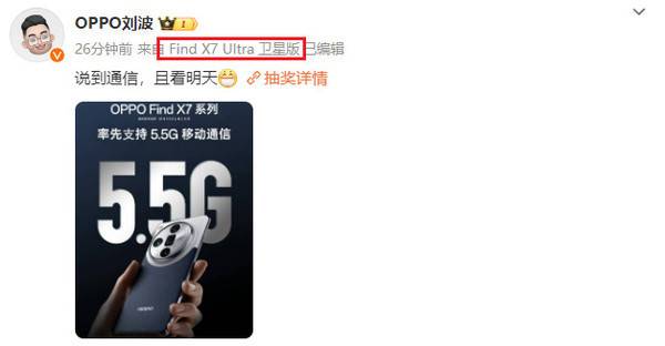 除了將率先支持5.5G移動通信,OPPO Find X7 Ultra衛星通信版似乎也要來了。OPPO中國區總裁劉波發文稱:說到通信,且看明天,微博小尾巴為“OPPO Find X7 Ultra衛星版”。由此來看,明天OPPO或將正式推出該機型,OPPO Find X7 Ultra衛星通信版可能會直接搭載5.5G技術。