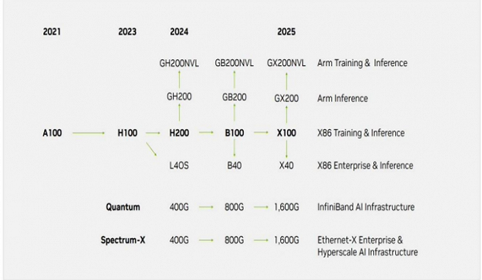英偉達2021-2025年的產品路線圖,昭昭然的將這個野心公示全球。其中標粗的是其核心的GPU產品,從A100迭代到H100,然后再到今年的B100,再到2025年的X100,路線非常清晰,也是AI產業鏈關注的焦點。