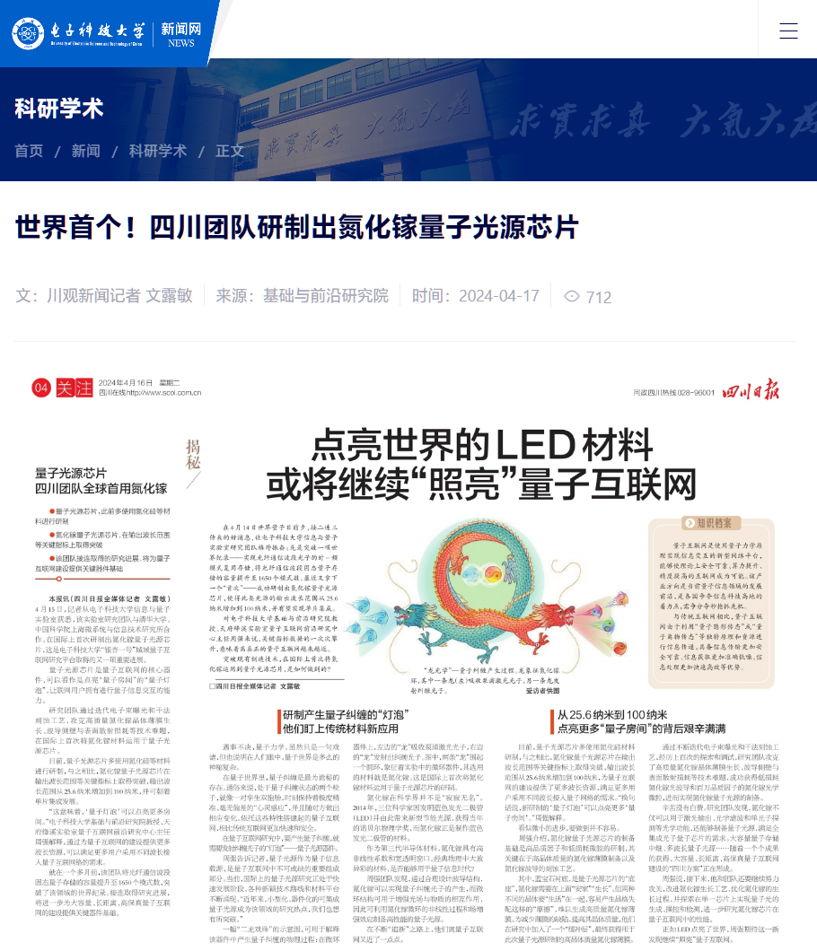 4 月 18 日消息,綜合電子科技大學新聞網、《四川日報》報道,電子科技大學信息與量子實驗室研究團隊與清華大學、中國科學院上海微系統與信息技術研究所合作,在國際上首次研制出氮化鎵量子光源芯片。這也是電子科技大學“銀杏一號”城域量子互聯網研究平臺取得的又一項重要進展。