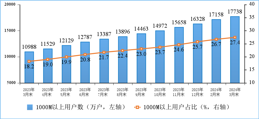數據顯示,截至2024年3月末,三家基礎電信企業的固定互聯網寬帶接入用戶總數達6.47億戶,比上年末凈增1089萬戶。其中,100Mbps及以上接入速率的固定互聯網寬帶接入用戶達6.12億戶,占總用戶數的94.5%;1000Mbps及以上接入速率的固定互聯網寬帶接入用戶達1.77億戶,比上年末凈增1410萬戶,占總用戶數的27.4%,占比較上年末提升1.7個百分點。