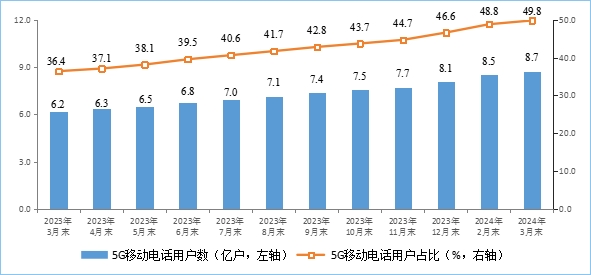飛象網訊(致新/文)4月23日消息,據工信部近日公布的《2024年一季度通信業經濟運行情況》顯示,截至2024年3月末,三家基礎電信企業及中國廣電的移動電話用戶總數達17.55億戶,比上年末凈增1124萬戶。其中,5G移動電話用戶達8.74億戶,比上年末凈增5157萬戶,占移動電話用戶的49.8%,占比較上年末提高3.2個百分點。