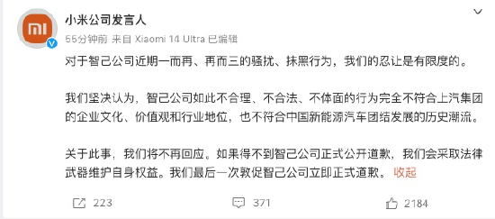 小米:最后一次敦促智己公司立即正式道歉,如果得不到道歉將法律維權