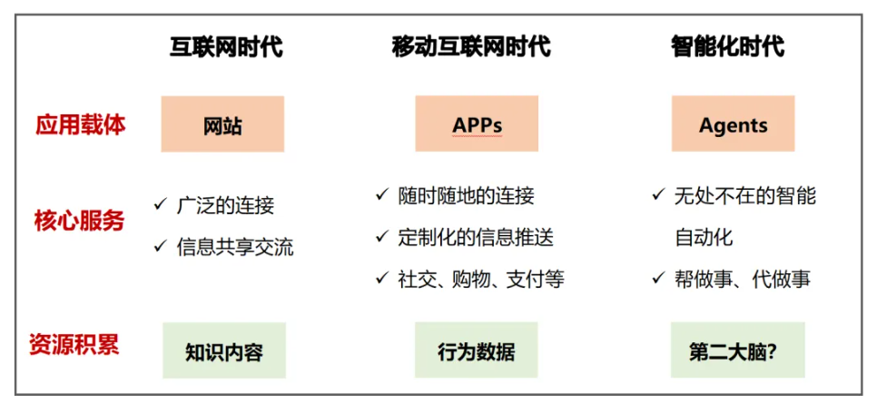 二是APP與智能終端積累個人軌跡數據,使行為智能成為可能。互聯網時代網站崛起,人類實現廣泛的信息共享交流,積累豐富的知識內容,為大模型訓練提供了內容基礎。移動互聯網時代,人類生活逐步線上化,即時通訊、購物、健身、出行等APP匯聚用戶行為軌跡數據,為個人行為預測訓練提供了基礎。智能化時代,真正智能的個人Agent成為可能,從“幫你做事”到主動預測“代你做事”(代理性程度不一),Agent有望成為智能時代的核心應用載體,行為智能是本質特點。