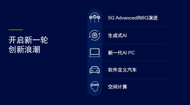 我們看到,近年來,顛覆性的科技創新成果不斷涌現,這為發展新質生產力提供了重要的基礎,也助力開啟新一輪創新浪潮,包括5G Advanced向6G演進;生成式AI為各行業帶來廣闊機遇;AI PC將生產力提升到全新的水平;軟件定義汽車重塑駕乘體驗;以及空間計算加速融合物理和數字世界等等。