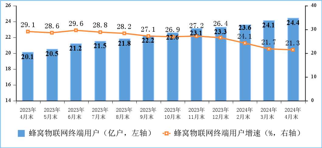 截至4月末,三家基礎電信企業發展蜂窩物聯網終端用戶24.4億戶