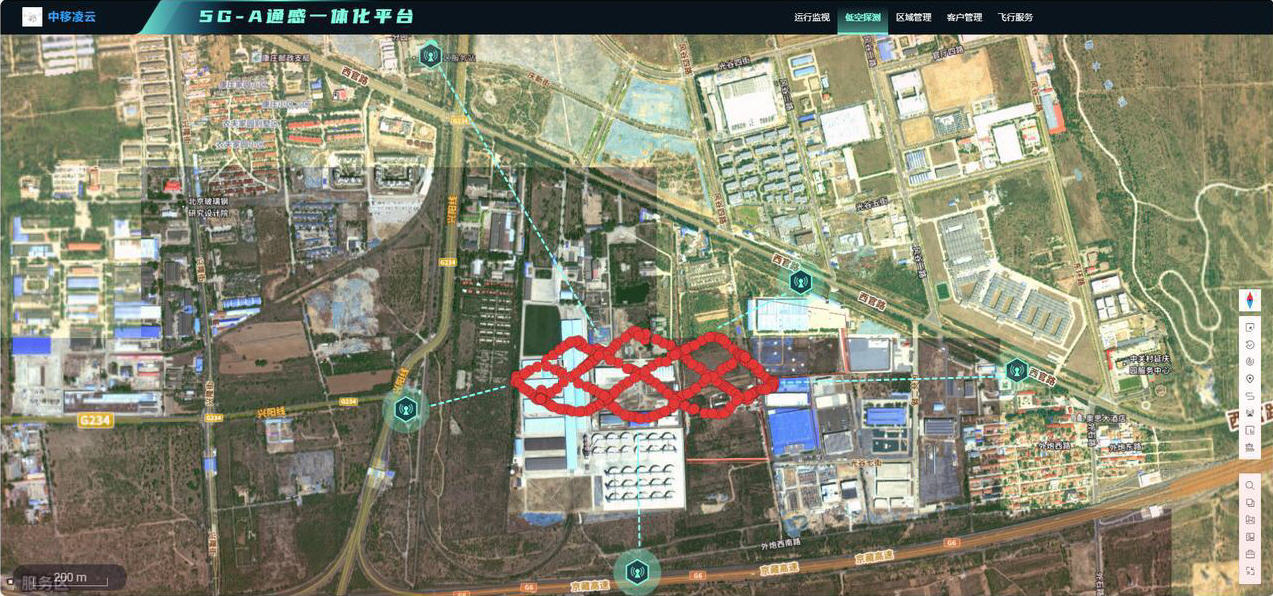 在位于延慶區的北京市民用無人駕駛航空試驗區,北京移動用5座5G-A通感一體基站組成了面積為3.3平方公里(相當于500個足球場的面積)的無縫感知5G-A覆蓋區域,結合具備低空感知、網聯飛行、空域管理和AI分析等多項能力的管理平臺,搭建起一套端到端低空無人機管控系統,打造高標準無人駕駛航空示范區。