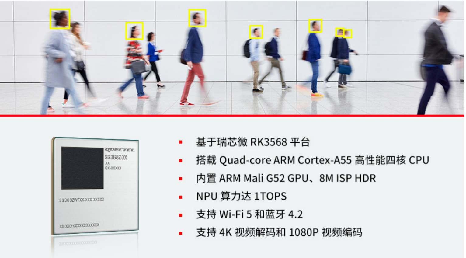 SG368Z系列基于瑞芯微RK3568平臺,搭載ARM 高性能四核Cortex-A55 CPU和ARM Mali G52 GPU,主頻高達2 GHz,NPU算力達1 TOPS,可運行豐富的深度學習算法,為人臉識別、車牌識別、駕駛員安全帶識別、人流統計、安全帽檢測、電瓶車檢測、危險區域示警等提供完整場景應用和算法。目前,該系列模組已在多個生活場景中大量運用。