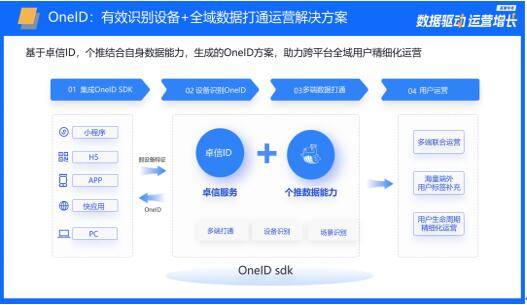 個推OneID是個推將中國信通院“卓信ID”與自身大數據能力深度融合所打造的解決方案,能夠幫助企業跨平臺識別目標設備,將多端數據安全融合打通,從而實現跨端用戶運營。個推OneID支持同一家企業的多個APP之間,APP和微信、支付寶、抖音、快手等主流平臺的小程序之間,以及不同平臺的小程序之間的數據打通,幫助企業打破數據孤島,有效沉淀數據資產。