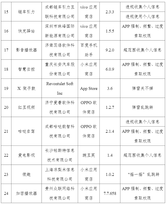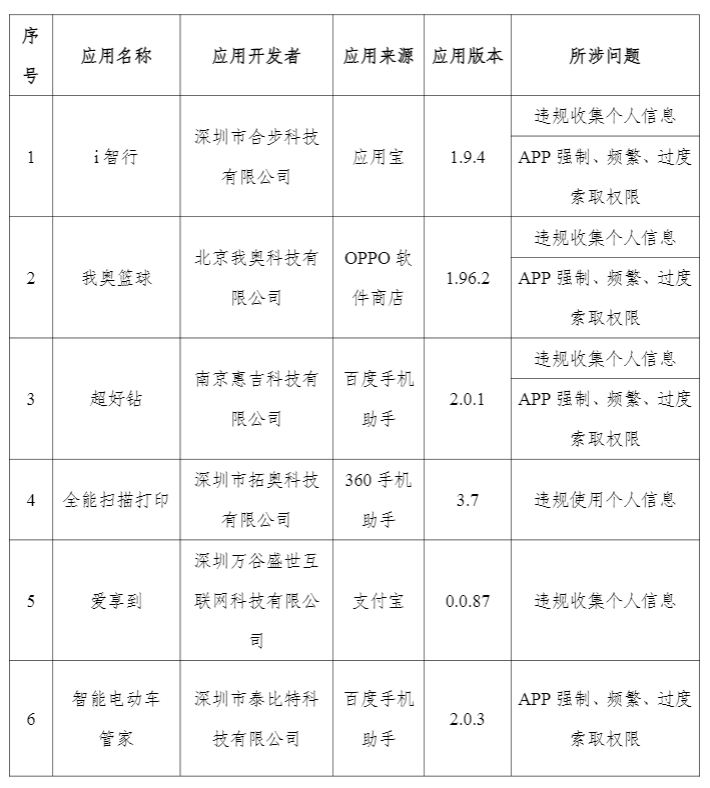 通報顯示,在50款App及SDK中,27款存在強制、頻繁、過度索取權限的問題,包括智能電動車管家(2.0.3)、衛星導航地圖(3.3.9)等;20款存在違規收集個人信息的問題,包括i智行(1.9.4)、我奧籃球(1.96.2)等;7款存在超范圍收集個人信息的問題,如影音播放器(9.2.0)、愛電影視(1.4)等。