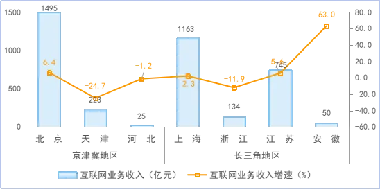 京津冀、長三角地區互聯網業務收入平穩增長。1—4月份,京津冀地區完成互聯網業務收入1744億元,同比增長1%,占全國互聯網業務收入的31.4%。長三角地區完成互聯網業務收入2091億元,同比增長3.3%,占全國互聯網業務收入的37.7%。