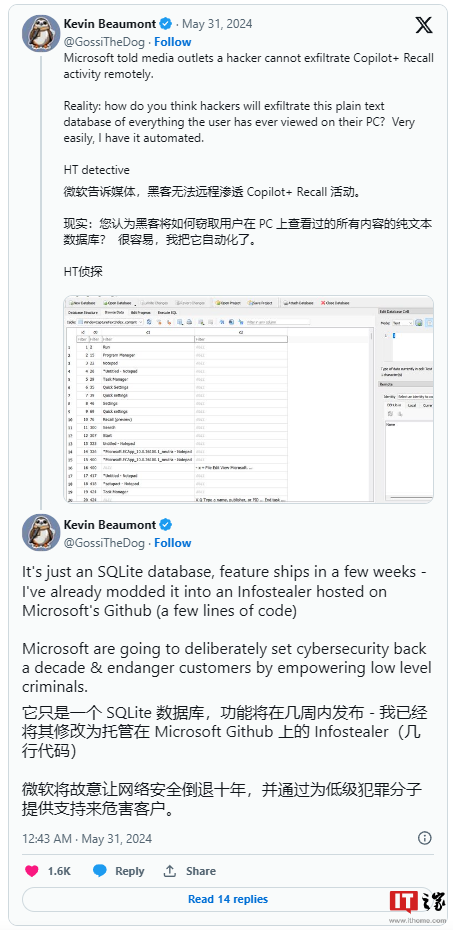 IT之家注意到,網絡安全專家凱文・博蒙特 (Kevin Beaumont) 在社交平臺上指出,經過調查,他發現“回顧”功能的日志系統僅僅是一個 SQLite 數據庫,并稱該功能的存在“讓網絡安全倒退十年”。他建議用戶在 Copilot+ 上線后立即禁用“回顧”功能,以防止數據泄露。