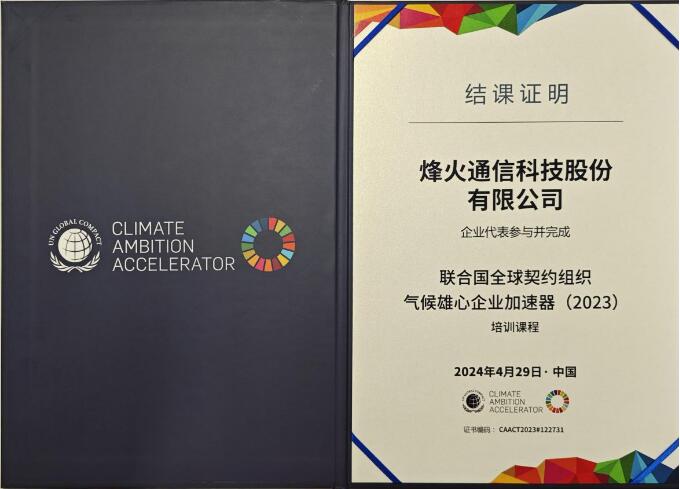 近日,聯(lián)合國全球契約組織(UNGC)2023年氣候雄心企業(yè)加速器項目(CAA)結(jié)課儀式在上海舉行,烽火通信等20余家中國企業(yè)被授予2023年度氣候雄心企業(yè)加速器項目結(jié)課證書,以表彰企業(yè)在應對氣候變化、碳目標設(shè)定與減排行動方面的積極努力。