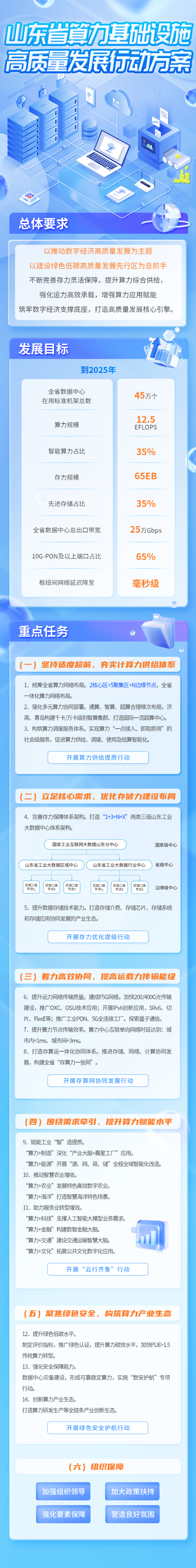 行動方案以推動數(shù)字經(jīng)濟(jì)高質(zhì)量發(fā)展為主題,以建設(shè)綠色低碳高質(zhì)量發(fā)展先行區(qū)為總抓手,通過不斷完善存力靈活保障,提升算力綜合供給,強(qiáng)化運力高效承載,增強(qiáng)算力應(yīng)用賦能,統(tǒng)籌通用算力、智能算力、超級算力協(xié)同計算,大中小城市協(xié)同布局,算力、數(shù)據(jù)、算法協(xié)同應(yīng)用,以筑牢數(shù)字經(jīng)濟(jì)支撐底座,打造高質(zhì)量發(fā)展核心引擎。方案明確了夯實計算力供給體系、優(yōu)化存儲力建設(shè)布局、提高運載力傳輸能級、提升算力賦能水平、構(gòu)筑算力產(chǎn)業(yè)生態(tài)、組織保障等6方面重點任務(wù),部署了算力供給提質(zhì)、存力優(yōu)化提級、存算網(wǎng)協(xié)同發(fā)展、“云行齊魯”、綠色安全護(hù)航等5大行動。