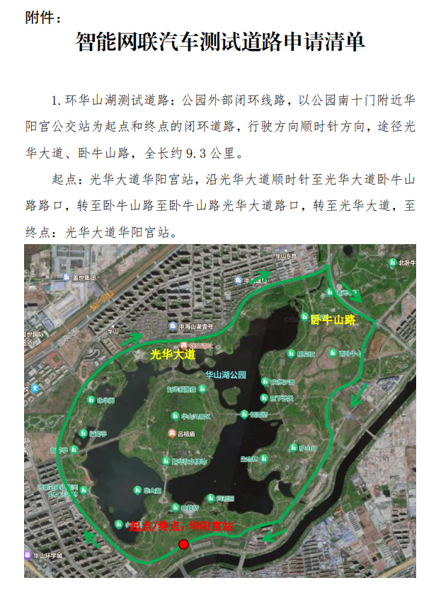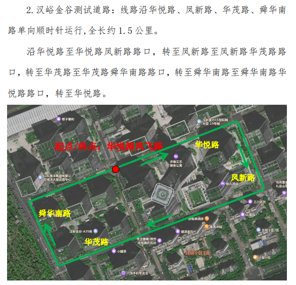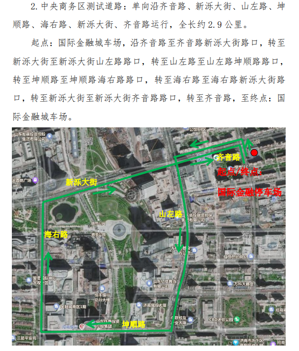 濟南公示的測試路段有三段,涉及華山湖、中央商務區及漢峪金谷,其中環華山湖測試道路起點華陽宮站,結束華陽宮站,全長約 9.3 公里;中央商務區測試道路起點國際金融停車場,結束國際金融停車場,全長約 2.9 公里;漢峪金谷測試道路,起點華悅路鳳飛路,結束華悅路鳳飛路,全長約 1.5 公里。