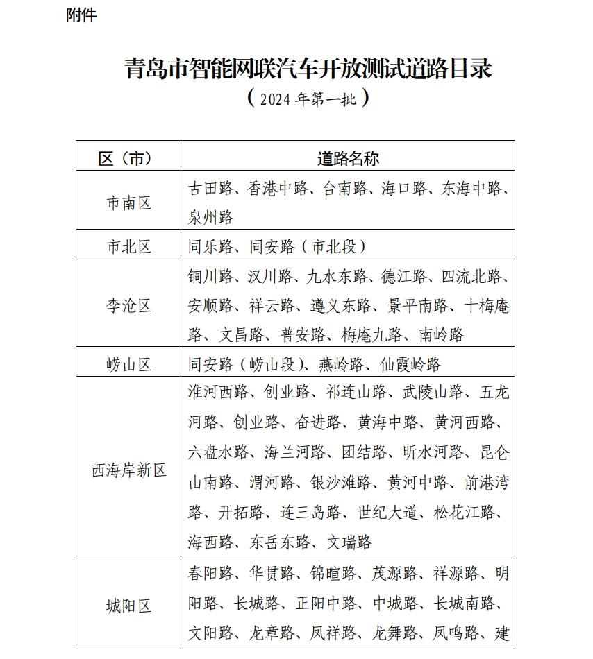 此外,青島市工業和信息化局也發布了《關于公布青島市智能網聯汽車開放測試道路目錄(2024 年第一批)的通知》,涉及市南區、市北區等八個區(市)共 121 條道路,其中部分道路僅開放特定路段。