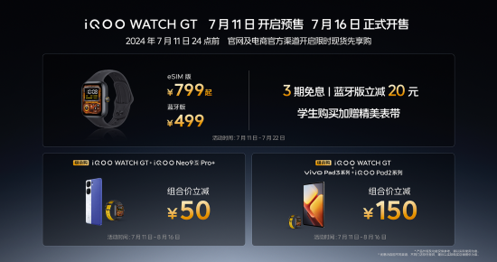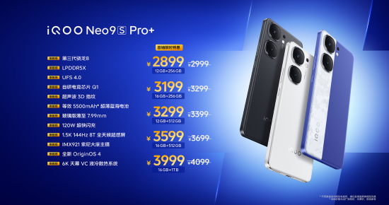 iQOO Neo9S Pro+共有Buff藍、星曜白和格斗黑三種配色,提供12GB+256GB、12GB+512GB、16GB+256GB、16GB+512GB和16GB+1TB存儲組合可選,到手價2899元起;iQOO WATCH GT eSIM版售價799元起,藍牙版499元,7月11日—7月22日下單藍牙版立減20元,到手價僅需479元; iQOO Pad2 Pro到手價 3299元起;iQOO TWS 1i售價 99元,與iQOO Neo9S Pro+組合購買可享至高40元優(yōu)惠,到手僅需59元。