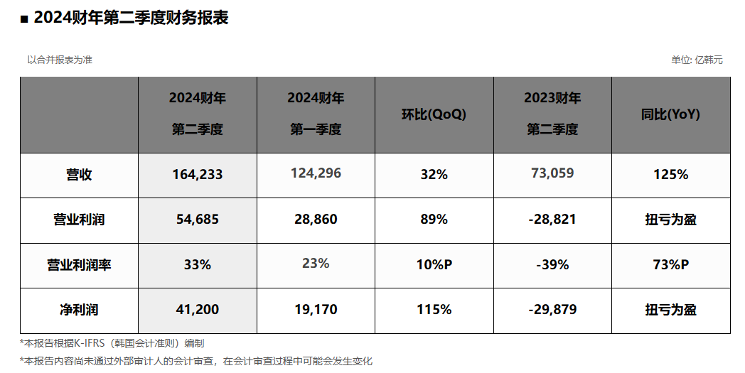 7 月 25 日消息,SK 海力士剛剛發布了截至 2024 年 6 月 30 日的 2024 財年第二季度財務報告,結合并收入為 16.4233 萬億韓元(IT之家備注:當前約 862.39 億元人民幣),同比增長 125%,環比增長 32%,大幅超過 2022 年第二季度的 13.811 萬億韓元記錄再創歷史新高。