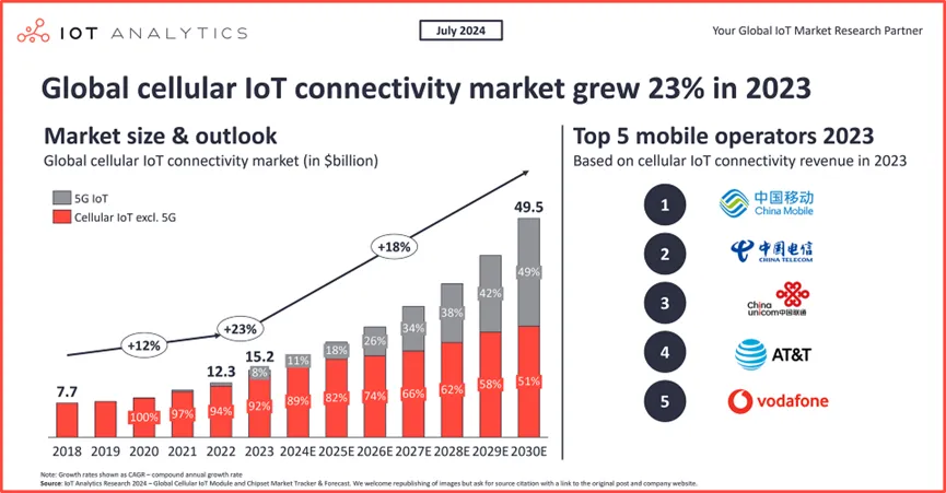 根據IoT Analytics的跟蹤,運營商的蜂窩物聯網收入從2010年至2023年期間以16%的年復合增長率增長。IoT Analytics預測,從2024年開始這一增速可能會加快,預計到2030年的復合增速將超過18%。從這一數據來看,蜂窩物聯網的收入增速超過了物聯網軟件和大型企業對物聯網支出的增速,表明蜂窩連接對于物聯網設備的重要性在不斷增加。