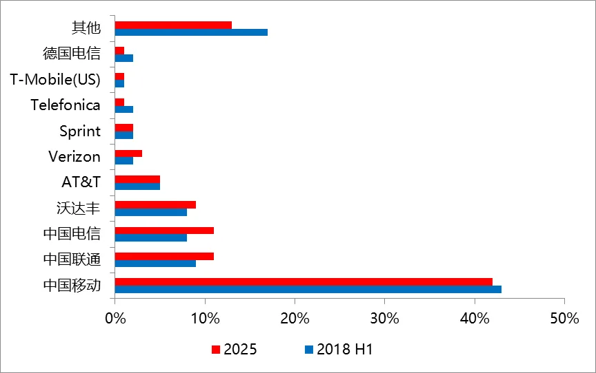 此前,筆者曾在《信息通信技術與政策》雜志上撰文,引用2018年市場研究機構Counterpoint的數據,對運營商蜂窩物聯網數據進行分析。Counterpoint在其報告中總結了截止到2018 年6 月底全球運營商已經在網的蜂窩物聯網連接數占比,并預測了2025 年可能形成的蜂窩物聯網連接的分布情況。報告顯示,截止到2018 年6月底,全球移動物聯網連接的集中度非常高,83%的連接集中在10 家運營商手里。其中,連接數最多的前5家運營商占據的份額為73%,而中國的三大運營商則位列全球前三,全球移動物聯網連接中60%都由中國三大運營商承載。同時,到2025年全球移動物聯網連接的集中化趨勢將更為明顯。