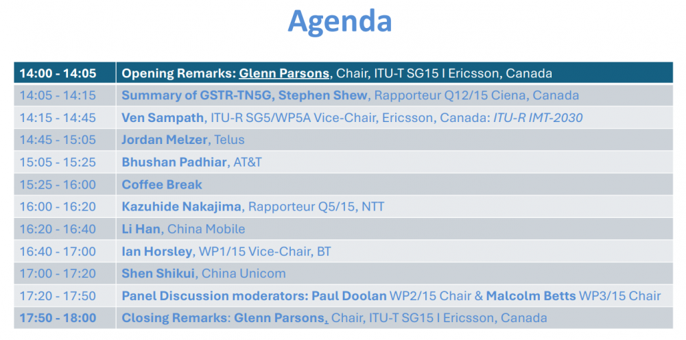 2024年7月1~13日,國際電信聯盟標準化部門(ITU-T)第15研究組(SG15)全會在加拿大蒙特利爾召開,共有來自幾十個國家的200多名標準代表現場參會。會議期間(7月7日)召開了一次主題為《 The Evolution of Transport and Access Networks to Support IMT 2030/6G》的高峰論壇【1】。論壇由SG15主席Glenn Parsons先生,聯合SG15管理層WP2主席Paul Doolan先生和WP3主席 Malcolm Betts先生共同主持,來自Ciena,Ericsson,Telus, AT&T, NTT, 中國移動,BT和中國聯通的多位專家相繼發表精彩演講。
