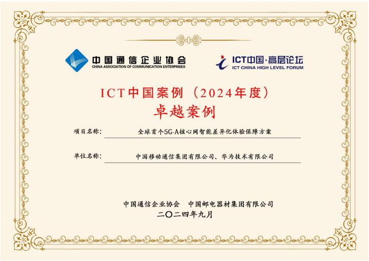 中國移動集團聯合華為申報的5G-A核心網智能差異化體驗保障方案榮獲“ICT中國(2024年度)” 一等獎