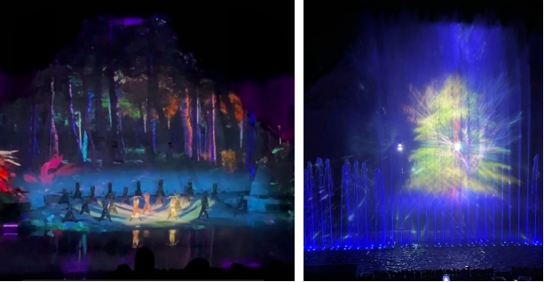 演出現(xiàn)場(chǎng),演員與山體上的宏大投影(左側(cè))以及水幕上的投影(右側(cè))交相輝映,令觀眾如癡如醉