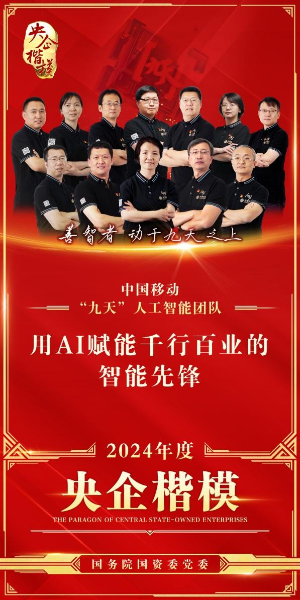 1月15日,國務院國資委黨委發布2024年度“央企楷模”,并召開中央企業“時代楷模”“央企楷模”代表座談會,中國移動“九天”人工智能團隊榮耀入選。十多年來,中國移動“九天”人工智能團隊搶抓時代機遇、把握科技脈動、立足產業實際,推進AI走進千家萬戶、賦能千行百業。