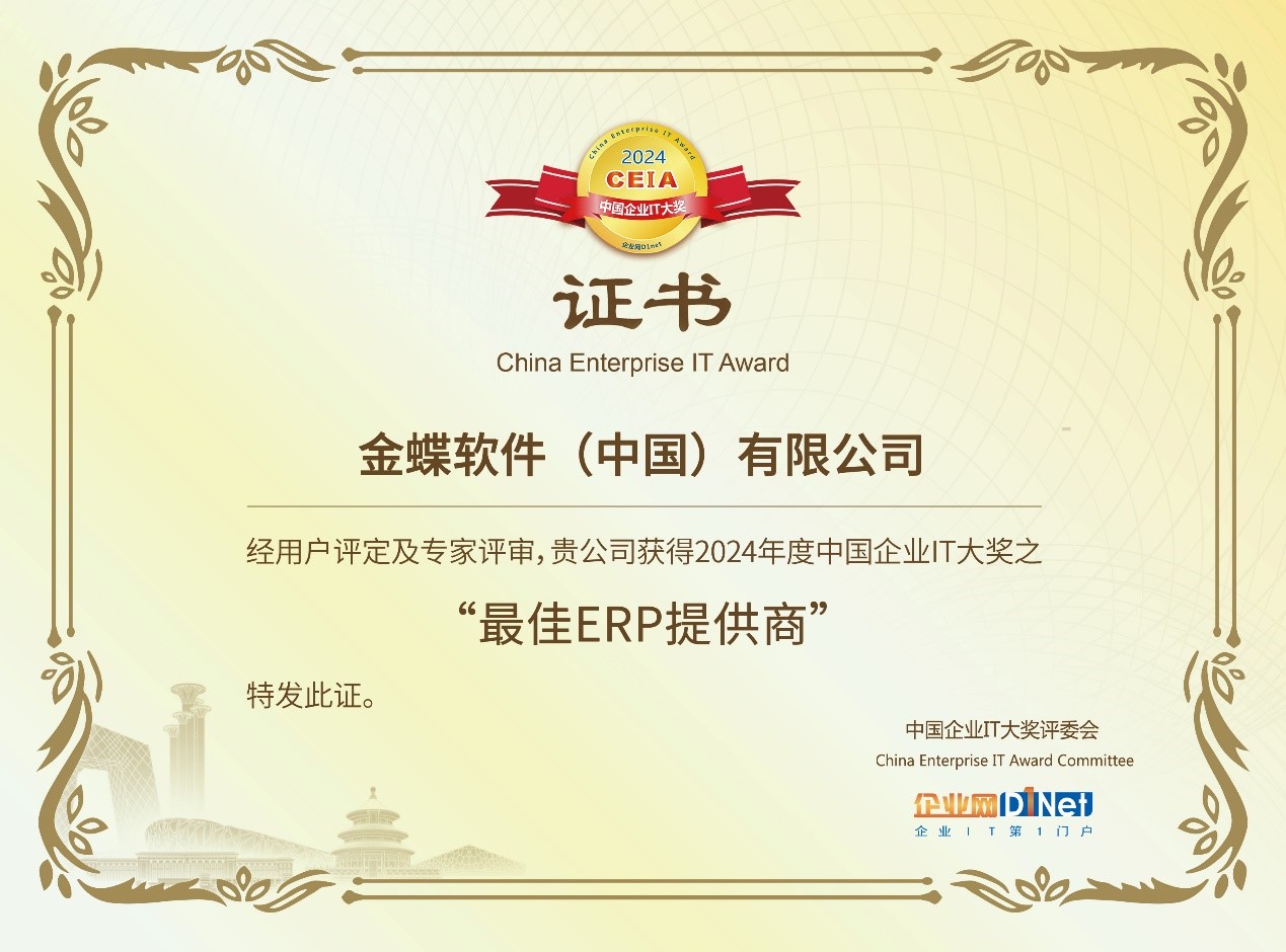 由政企市場專業媒體企業網D1net、信眾智(CIO智力輸出及社交平臺)和中國企業數字化聯盟聯合主辦的“2024 CEIA中國企業IT大獎”于2025年1月15日重磅揭曉。此次評選活動吸引了眾多國內外知名企業的積極參與,包括戴爾科技集團、亞馬遜云科技、IBM、聯想集團、新華三、華為、阿里云、金蝶、浪潮信息等業界巨頭。金蝶軟件(中國)有限公司(以下簡稱“金蝶”)獲評2024 CEIA中國企業IT大獎之“最佳ERP提供商”獎。