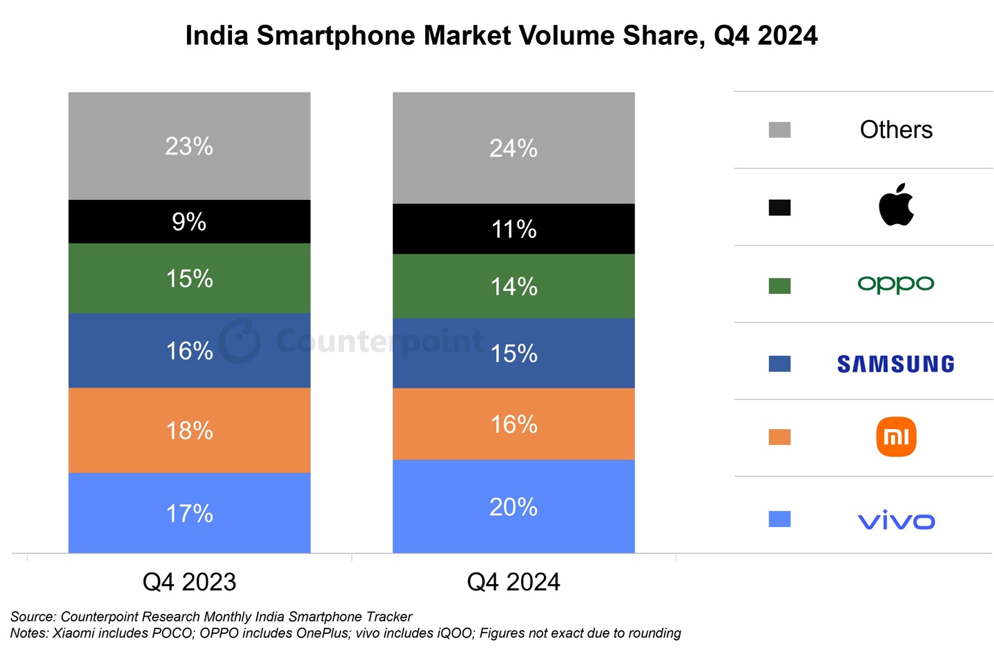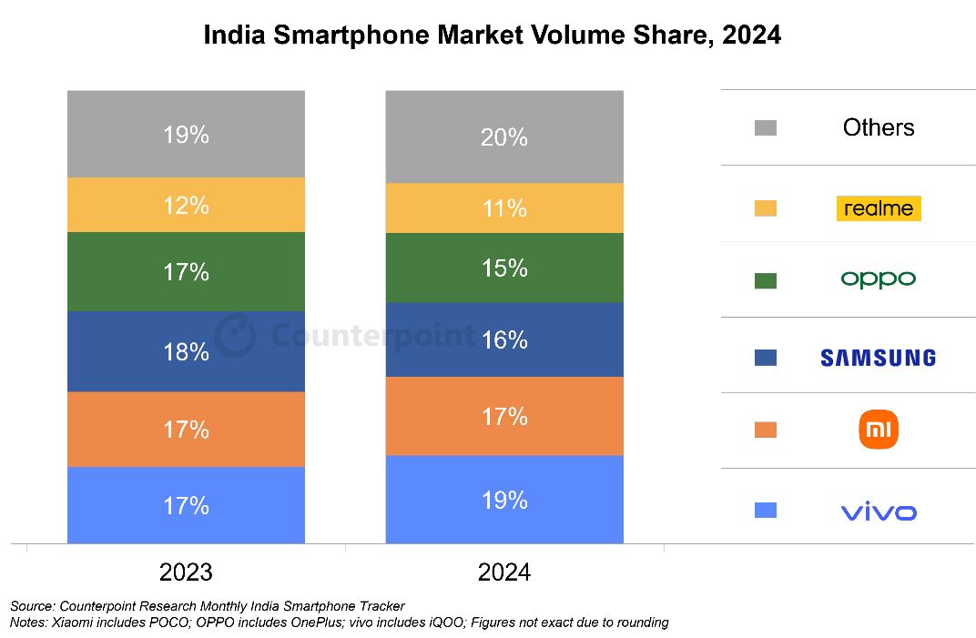 2024 年第 4 季度印度智能手機(jī)出貨量