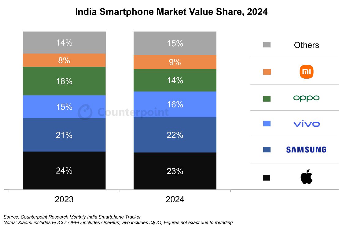報(bào)告稱 2024 年印度智能手機(jī)出貨量達(dá)到 1.53 億臺(tái),同比增長(zhǎng) 1%;但歸功于高端手機(jī)的強(qiáng)勁需求以及消費(fèi)者對(duì)高價(jià)位手機(jī)的偏好,手機(jī)出貨額同比增長(zhǎng) 9%,創(chuàng)歷史新高。