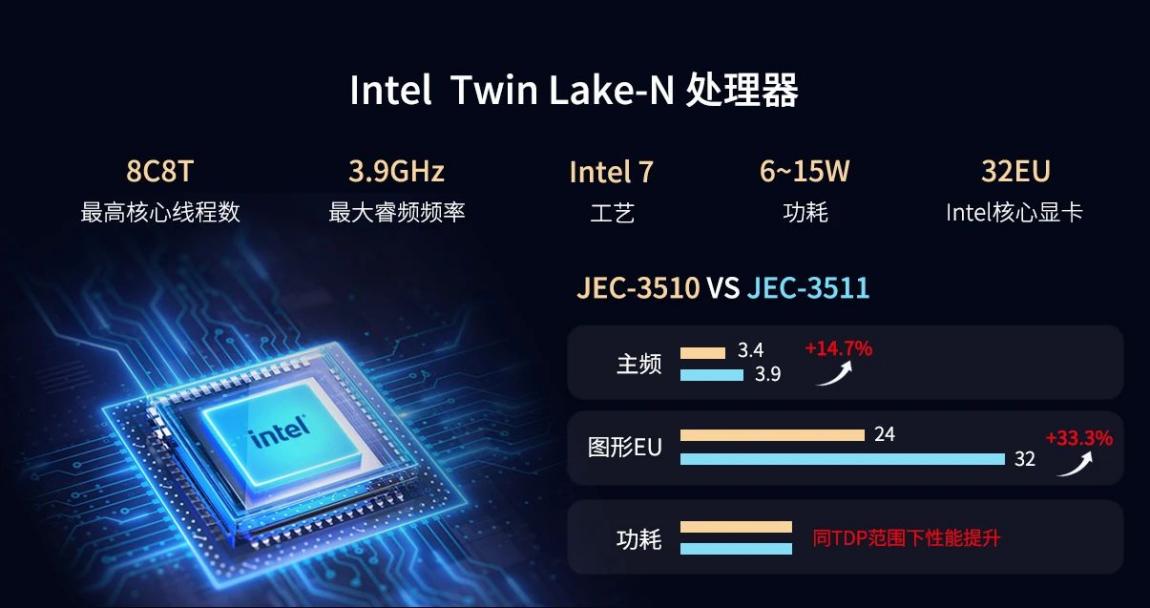 相較前代主力機型JEC-3510,JEC-3511支持PIN對PIN兼容,實現零成本替換升級,助力用戶在工業自動化、邊緣AI、工業網關等應用場景中輕松完成性能躍遷。