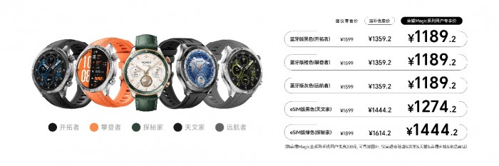 目前,榮耀手表5 Pro已開啟首銷,共有藍牙和eSIM兩個版本可選,其中藍牙版本,攀登者(橙色)、開拓者(黑色)、遠航者(灰色)首銷國補優惠價1359.2元;eSIM版本,天文家(黑色)首銷國補優惠價1444.2元,探秘家(綠色)首銷國補優惠價1614.2元。首銷期榮耀Magic系列用戶,攀登者、開拓者、遠航者專享國補優惠價1189.2元,天文家專享國補優惠價1274.2元,探秘家專享國補優惠價1444.2元。