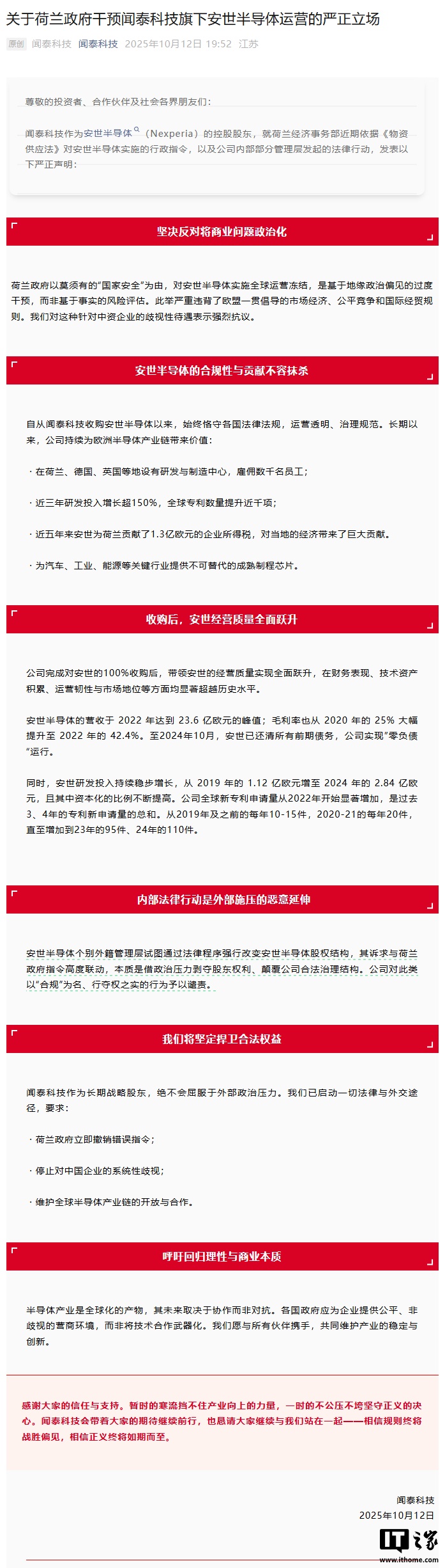 聞泰科技 10 月 12 日晚發(fā)表聲明,譴責(zé)荷蘭政府以“國家安全”為由凍結(jié)安世半導(dǎo)體全球運營,稱此舉違背市場經(jīng)濟原則。安世半導(dǎo)體個別外籍管理層試圖通過法律程序改變股權(quán)結(jié)構(gòu),聞泰科技認(rèn)為這是借政治壓力剝奪股東權(quán)利。公司表示將捍衛(wèi)合法權(quán)益,呼吁回歸商業(yè)本質(zhì)。